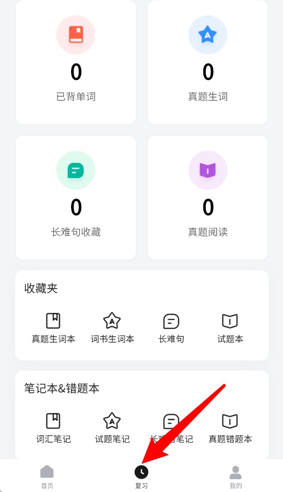3、点击底部“复习”按钮可进入错题记录、词汇生词、长难句等复习内容的归类页面进行查看。