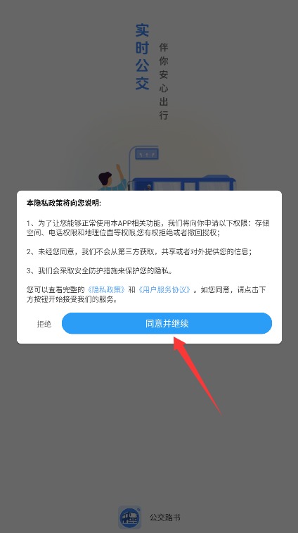 1、启动公交路书APP,阅读并同意用户协议与隐私政策后,点击同意进入功能主界面。