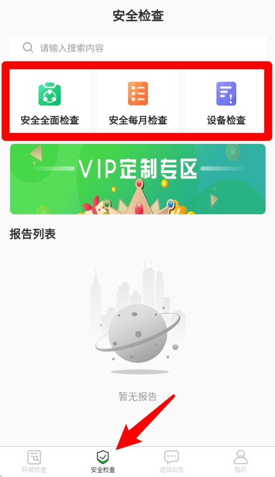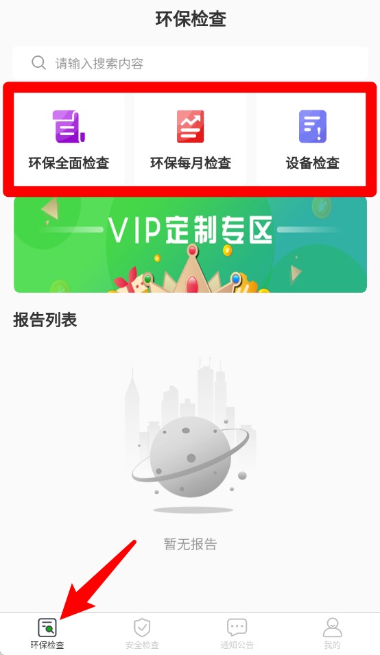 1、点击底部“环保检查”可进入全面检查、每月检查与设备检查三大模块操作入口。