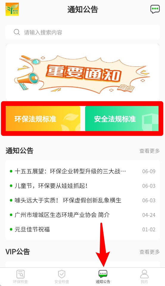 3、在“通知公告”页面可查看环保与安全相关的法规标准和平台最新通知信息。