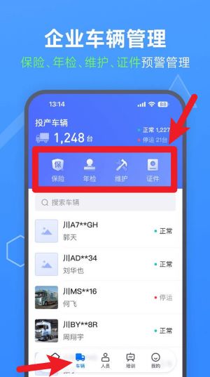 2、进入车辆管理页面后,可通过顶部分类标签选择“保险”“年检”等模块,查看并管理对应车辆的相关信息。