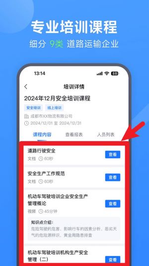 3、在培训详情页中,选择对应培训课程,点击“查看”按钮即可开始学习,并支持查看报告及参与人员名单。