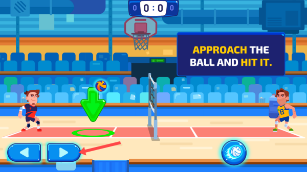 2、进入游戏场景,按照提示,点击下方箭头所指按钮操控角色接近排球。