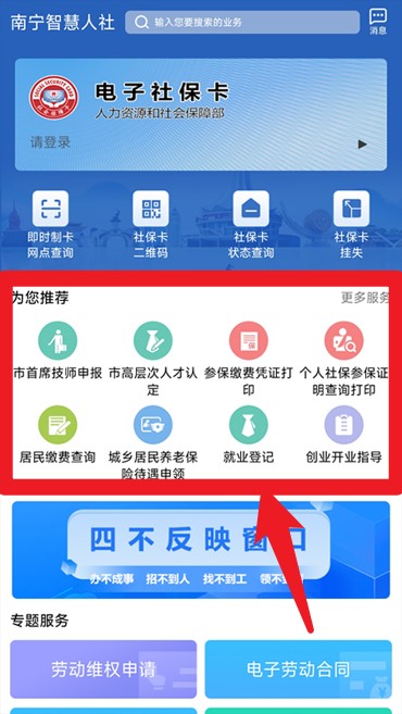 1、首页推荐模块集成参保证明打印、就业登记、人才认定等高频业务,方便用户快速办理。
