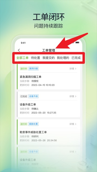 3、工单管理界面提供全部工单、待处理等分类,支持对工单状态进行持续跟踪与闭环管理。