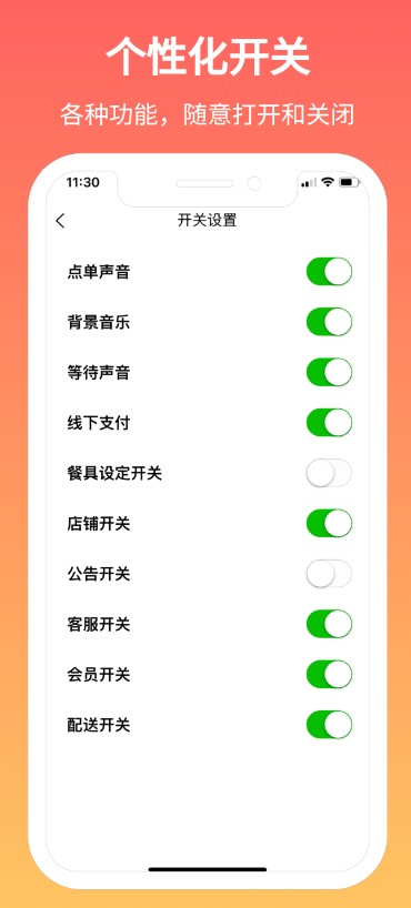 1、个性化开关设置界面可灵活控制各类功能按钮,便于商户根据运营需求随时启用或关闭对应模块。