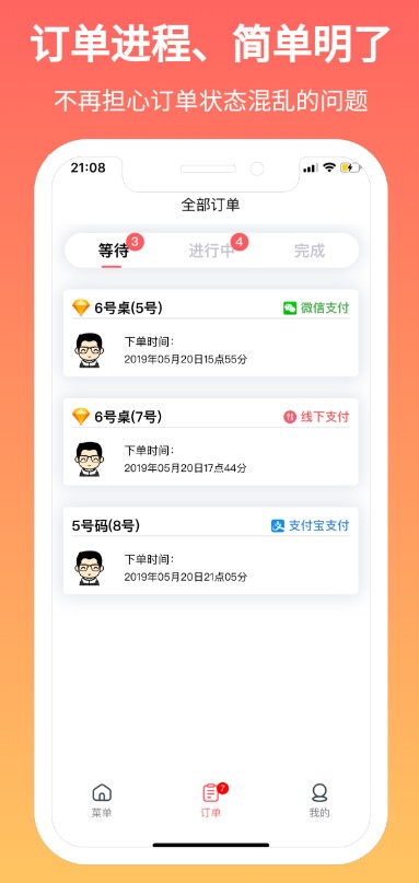 2、订单流程清晰展示多个状态,涵盖等待、进行中及完成,实时掌握顾客订单处理进度,避免混乱。