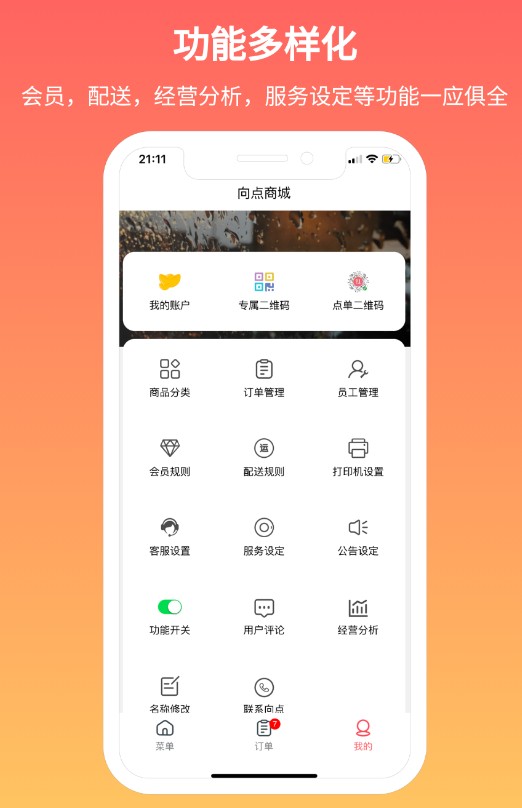 4、功能菜单布局清晰齐全,涵盖会员、配送、数据分析等多个模块,一站式满足店铺日常运营管理。