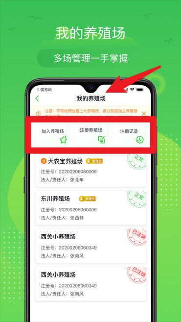 3、“我的养殖场”可添加或注册养殖场信息,实现多场数据统一管理。