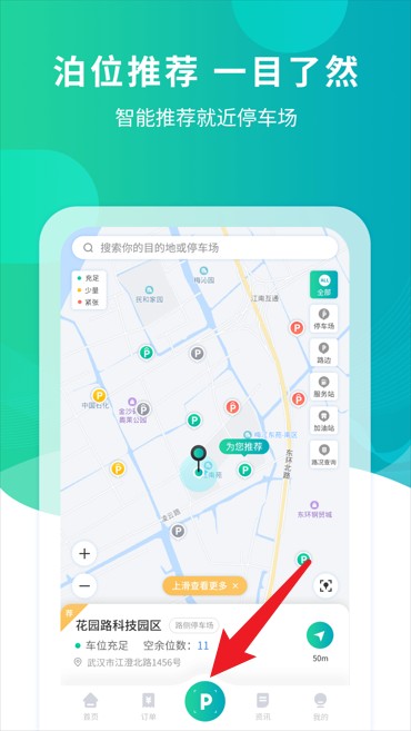 2、进入地图页后可智能推荐附近停车场,帮助快速找到空闲泊位。