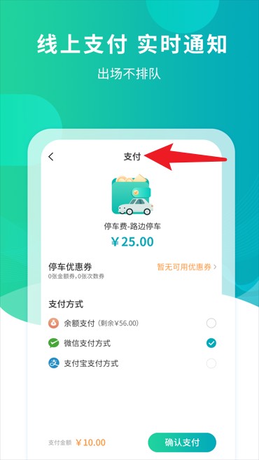 3、停车后进入支付页选择支付方式,在线完成缴费免去排队烦恼。