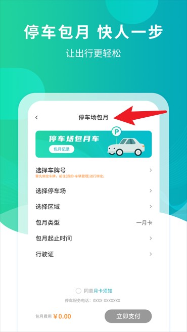 4、可选择“停车包月”功能,设定车牌与区域,按需办理月卡更方便。