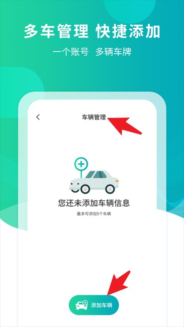 5、点击“车辆管理”可添加或管理多个车牌信息,一个账号多车通用。