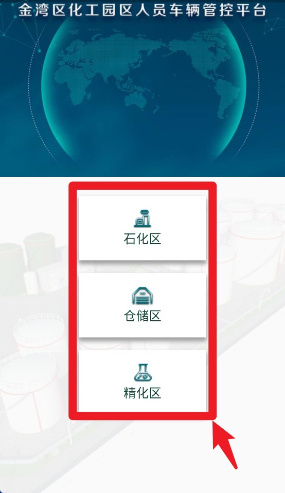 1、进入系统后可选择“石化区”“仓储区”“精化区”等模块进行人员或车辆管理。