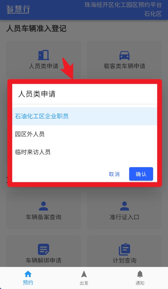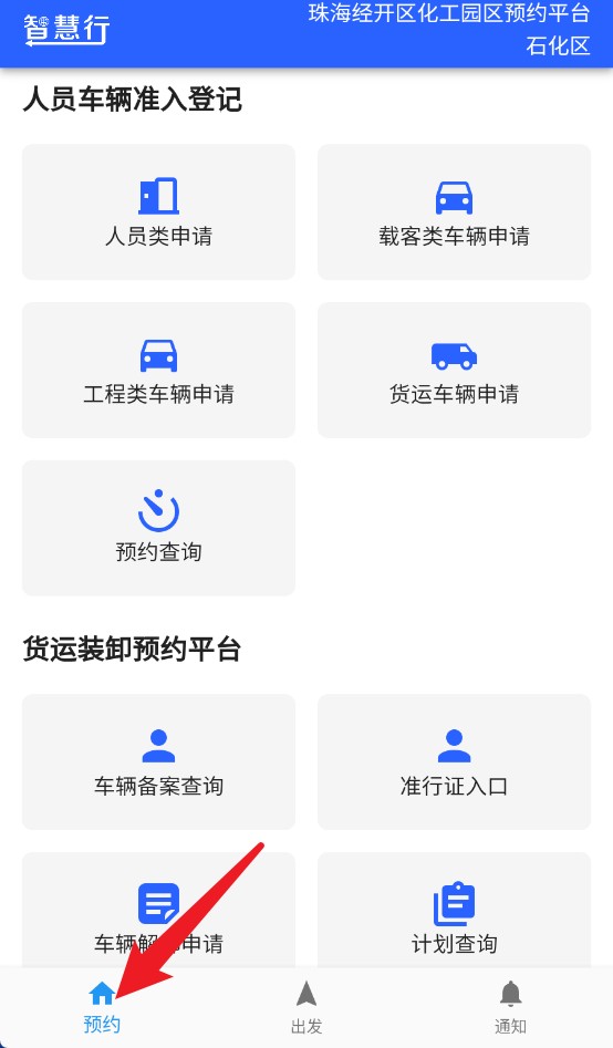 2、在“预约”页面可提交人员申请、车辆申请或进行货运类装卸备案登记操作。