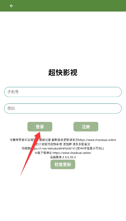 1、启动超快影视APP,在登录界面输入已注册的手机号和对应密码,点击登录进入主页面。