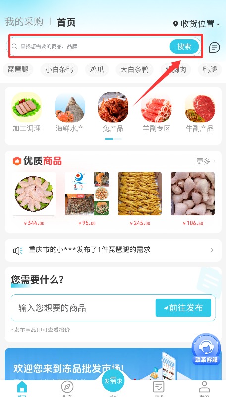 3、在首页搜索栏输入商品名称或品牌关键词,即可查找所需食材或供应商信息。
