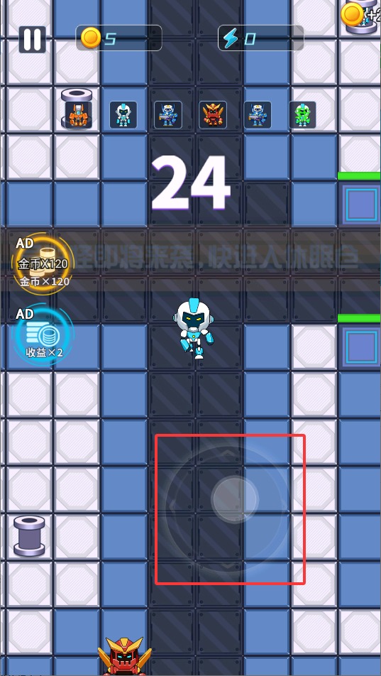 1、进入战场后通过手指滑动屏幕操控机甲恐龙移动,注意观察敌方行动轨迹,合理走位避开致命攻击。
