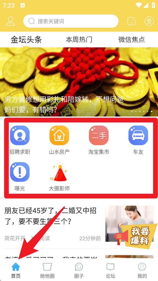 1. 进入首页后可浏览“金坛头条”“本周热门”等资讯内容,点击下方分类图标可快速访问招聘、房产、车友等频道。