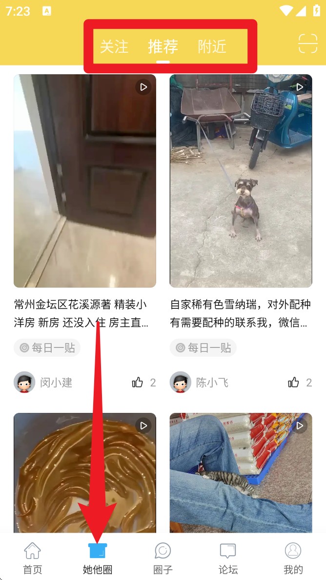 2. 切换至“她他圈”模块可浏览短视频动态内容,顶部分类有“关注”“推荐”“附近”等标签可自由筛选。