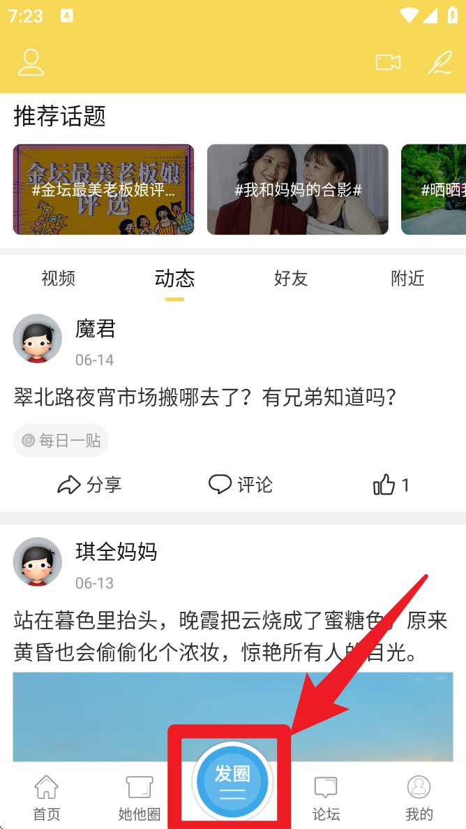 3. 进入“圈子”页面后点击下方蓝色“发圈”按钮,输入动态文字与图片,即可发布内容至平台。
