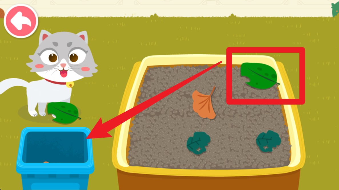 3. 在游戏中帮助小猫清理花园垃圾,将绿色树叶拖动到指定的蓝色回收桶中,锻炼孩子的动手能力与环保意识。