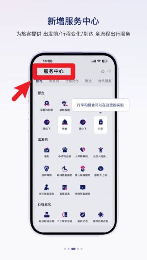 1、进入“服务中心”页面,即可办理订餐、购买行李、值机、特殊旅客服务等全流程出行事项,让出发前后都能更从容。