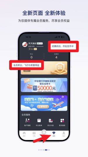 2、点击“会员”页签即可查看专属优惠与会员积分,轻松管理账户信息,解锁更多专属服务和飞行福利。