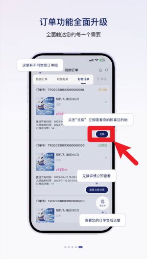 3、在“我的订单”页面中可查看不同类型订单,点击“兑换”即可查看行程详情,还能实时查询售后处理进度。