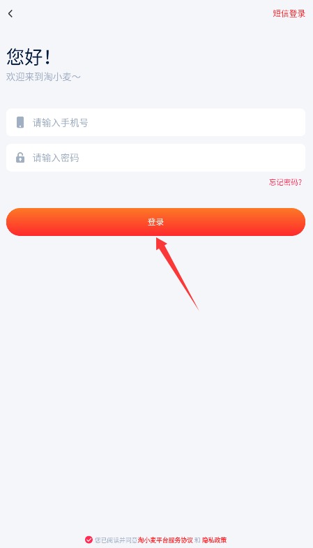 1、打开淘小麦APP,输入手机号和密码,勾选用户协议后点击登录进入主页面。
