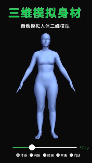 2、自动生成3D身体模型,根据你的身材数据模拟真实比例,让你清楚看到每一寸变化。