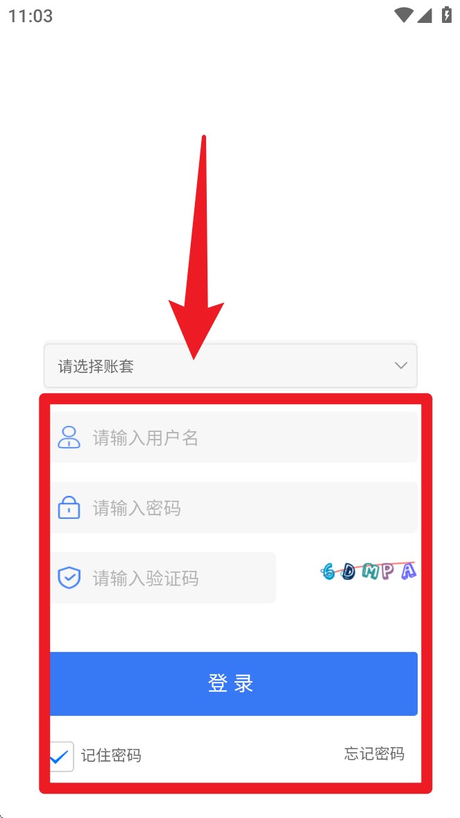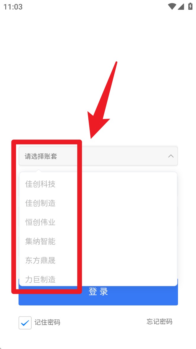 1. 初次打开APP请先点击选择账套,选取公司单位。