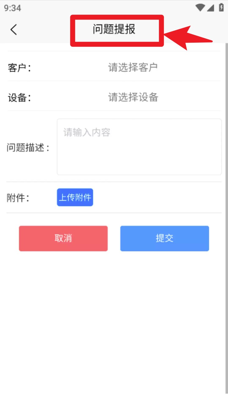 4. 进入问题提报页面输入客户名称以及选择设备型号,最后上传照片等才能回报异常。