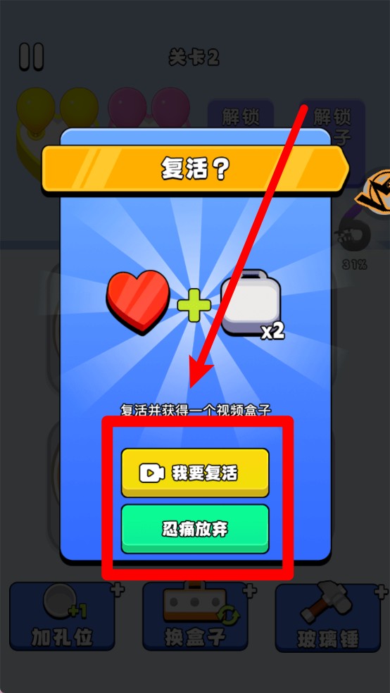 3.失败后可选择观看广告复活并获得奖励道具,点击“我要复活”按钮即可继续当前关卡挑战。