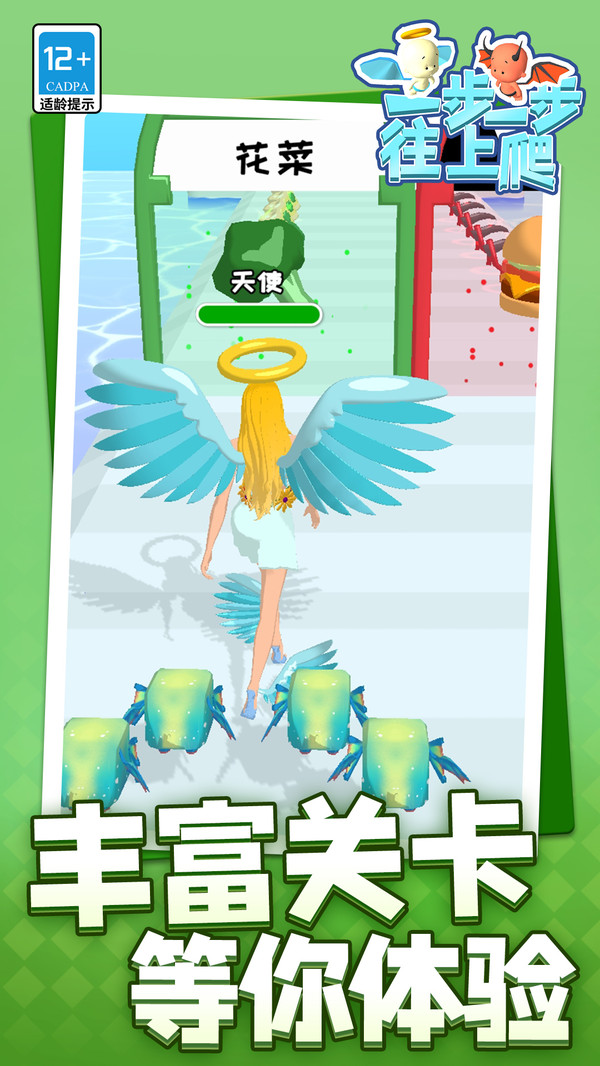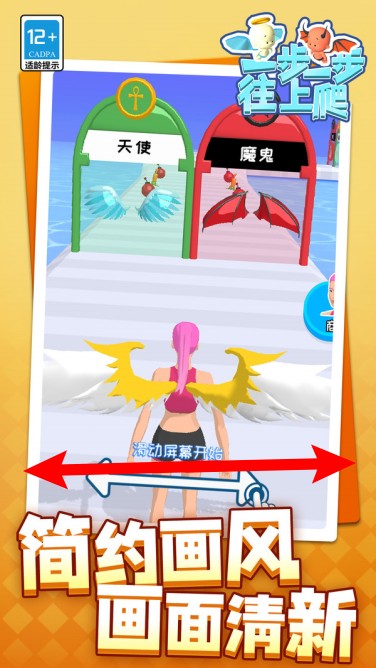 一步一步往上爬全程高能不掉速,随着能量收集角色逐渐进化,最终长出翅膀飞跃终点冲高分。天使恶魔双路线自由选择,外形变化超有视觉冲击,操作简单但超解压,节奏爽快停不下来,挑战每一关都充满惊喜,一步一步往上爬绝对让你越玩越上头!