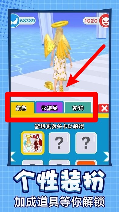 2.点击角色界面底部标签可进入角色、收藏品与宠物管理区,完成关卡可解锁更多外观与道具。