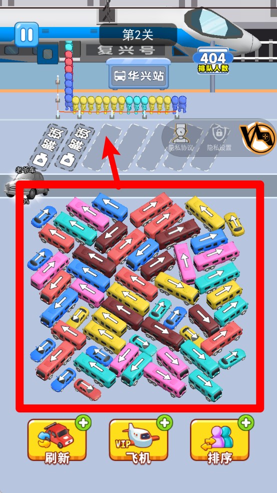 2.整理车辆顺序:玩家需依照车辆方向将阻挡的车逐一移开,让对应颜色的车先行驶出接送相应的乘客。