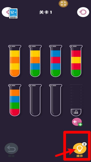 2.点击右下角的“提示”灯泡图标可获得当前关卡提示,帮助玩家快速理清颜色排序思路。