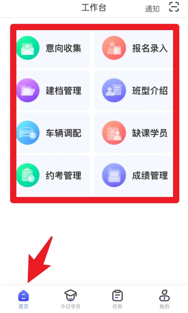 1. 进入首页可查看工作台功能,支持收集意向、录入报名、管理档案和协调车辆等教学管理操作。