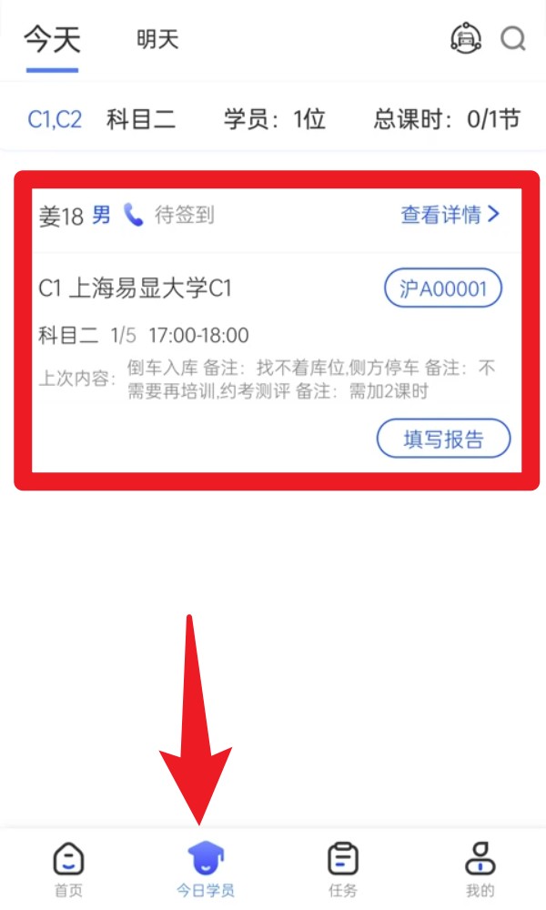 2. 点击「今日学员」标签页,可查看今日课程安排、学员签到状态、教学内容与备注说明。