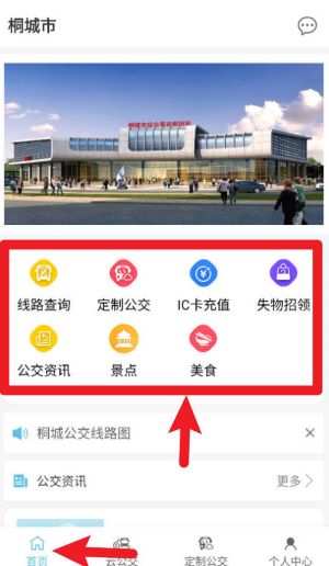 2、登录成功后进入首页,可以根据需求点击线路查询、IC卡充值等常用功能。
