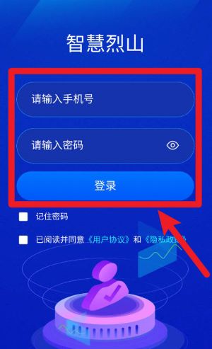 1、打开智慧烈山APP后,首先在登录页面输入手机号和密码,勾选同意相关协议后点击“登录”按钮即可进入系统首页。