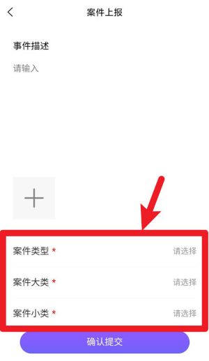 3、在案件上报界面中,用户可详细填写事件描述内容,并根据提示依次选择案件类型、大类和小类,确认无误后点击提交。