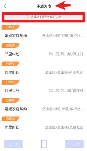 4、在矛盾纠纷处理列表页面中,用户可以查看所有已提交的案件信息,并通过上方搜索栏快速查询指定内容。