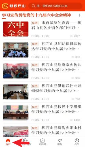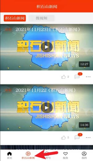 1、点击底部菜单中的“积石山新闻”图标,即可进入新闻视频页面,第一时间观看本地原创报道。