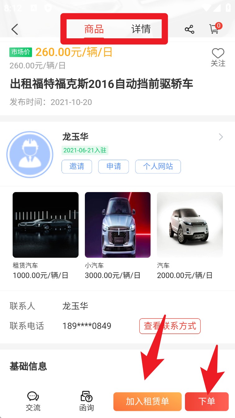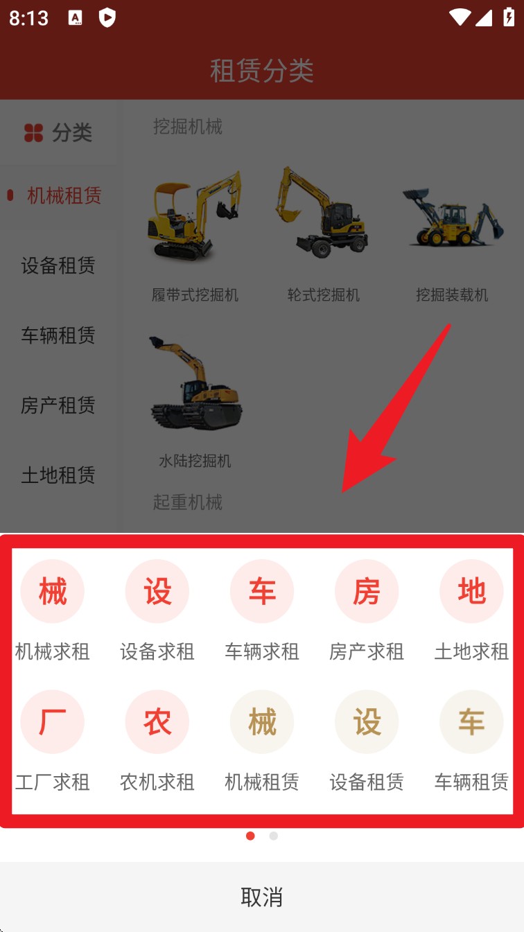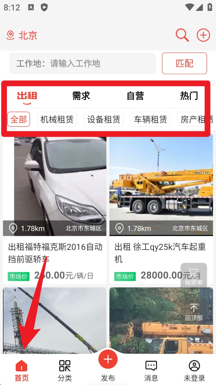 1. 进入首页后默认展示租赁信息,可通过上方标签筛选机械、设备、车辆等不同租赁类型。