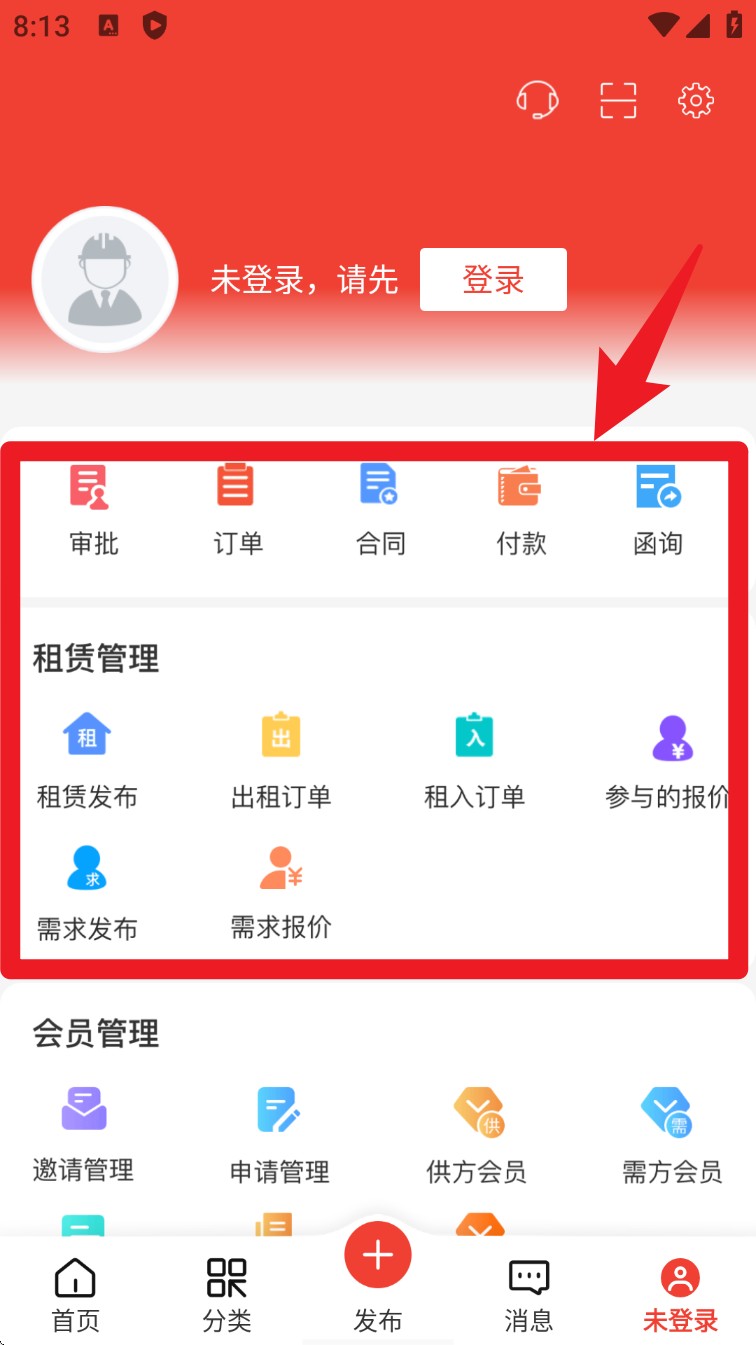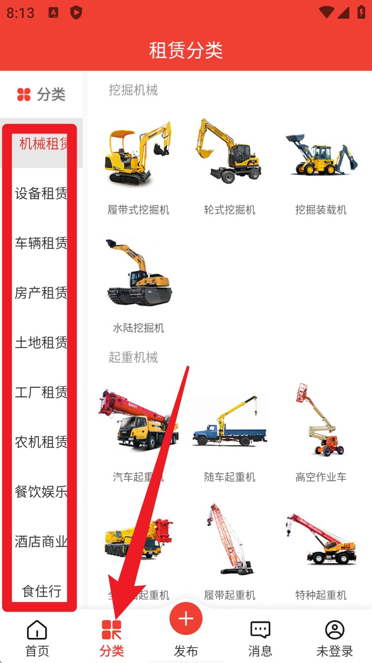 3. 底部导航点击「分类」,可进入租赁分类页,按行业或设备类型快速定位所需资源。