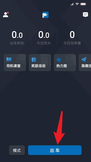 3、主页面提供出车按钮,进入工作状态后可查看今日流水、订单与任务进度等信息。