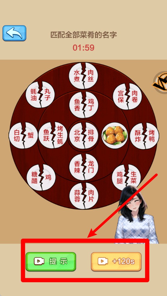 1.配对菜名解谜:在配对界面点击提示按钮可获取解题线索,点击+120s可延长时间助你冷静思考完成挑战。