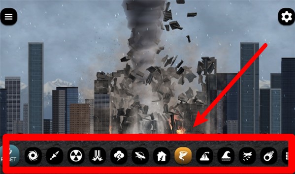 1.点击底部图标栏中的灾难按钮,可选择龙卷风、火山、海啸等自然灾害进行城市毁灭操作。